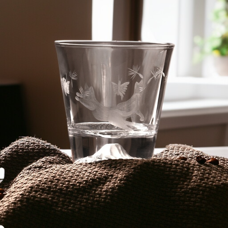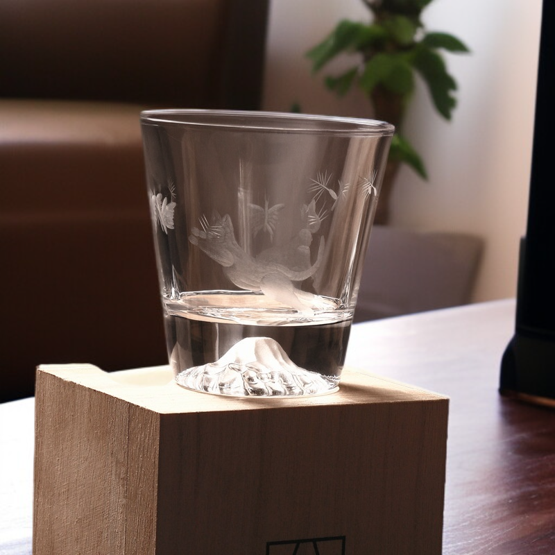 Szklanka z kotem w stylu japońskim i śnieżną Górą Fuji
